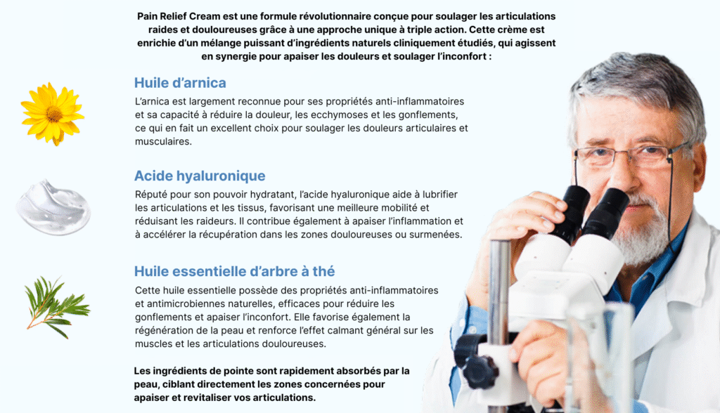 Pain Relief Cream est une formule révolutionnaire conçue pour soulager les articulations raides et douloureuses grâce à une approche unique à triple action. Cette crème est enrichie d’un mélange puissant d’ingrédients naturels cliniquement étudiés, qui agissent en synergie pour apaiser les douleurs et soulager l’inconfort :